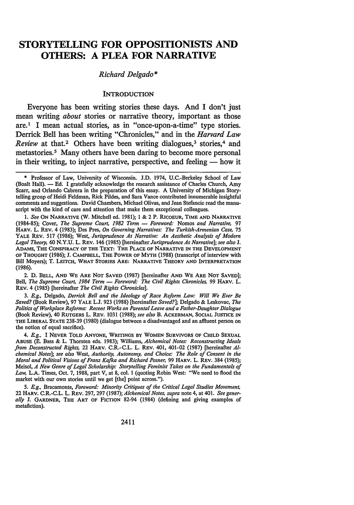 - Delgado, Richard (1989). “Storytelling for Oppositionists and Others: A Appeal for Narrative”. Michigan Law Review. Michigan Law Review, Vol. 87, No. 8. 87 (8): 2411–2441. doi:10.2307/1289308. JSTOR 1289308.
