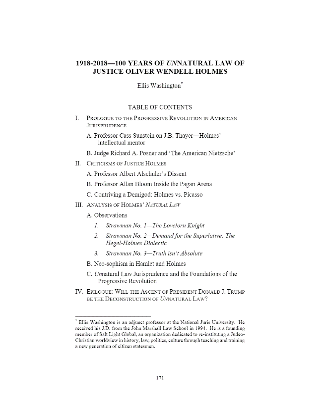 *N.B.: 30 Years Late! – On Oct. 2-3, 2017, I was given the first-time honor to be invited to a Law Symposium hosted by the Faulkner Law Review to deliver my Constitutional Law and Legal History paper on the singular champion of Evolution Atheism Jurisprudence – the iconic Socialist, Progressive, Activist, Anti-Natural Law jurist of the twentieth century – Justice Oliver Wendell Holmes, Jr. (SCOTUS: 1902-32). This paper was published that same year in the Faulkner Law Review and reprinted in my academic blog in – Ellis Washington, 1918-2018—100 Years of UnNatural Law of Justice Oliver Wendell Holmes, 9 Faulkner Law Review No. 1, 209 (Fall 2017), pp. 171-226.