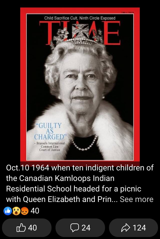 {Analysis} Regarding the 1964 event of the 10 missing Canadian Indian school children, it is imperative to understand that the British Royal Family sit atop the 13 Illuminati Royal Bloodline Families and that for this inbred reptilian cult to continue to exist and to thrive they must have a steady supply of human blood and human flesh which is their only food and drink. As they ascend the stairs up the Pyramid of Power, Satan demands human sacrifices (especially babies, children and close relatives). Thus, 12 years after coming to the royal throne this huge human sacrifice was required by her Satanic reptilian overlords to secure her throne, make Elizabeth II the most powerful queen in history, and to feed her demonic masters.