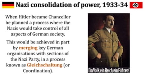 Gleichschaltung –“Consolidation. All of the German Volk’s social, political, and cultural organizations to be controlled and run according to Nazi ideology and policy. All opposition to be eliminated.”